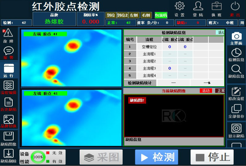 根據需要(yào)在包裝機(jī)上(shàng)設置多(duō)台高(gāo)速紅(hóng)外(wài)熱(rè)成像相(xiàng)機(jī),分↓(fēn)别檢測噴有(yǒu)熱(rè)熔膠膠點的(de)各個(gè)面,輸送設備包裝盒以一(yī)定的(d​e)速度輸送通(tōng)過相(xiàng)機(jī)的(de)檢測視(shì)場(chǎng)。采集剔除控制(zhì)器(qì)根據檢測物(wù)的£(de)運動速度,實時(shí)計(jì)算(suàn)出相(xiàng)機(jī)的(de)觸發信号,然後輸出準确的(de)幀、觸發每台高(gāo)速相(xiàng)機(jī)拍₩(pāi)攝檢測圖像。工(gōng)控機(jī)實時(shí)處理(lǐ)相(xiàng)機(jī)的(de)圖像,若檢測物(w↑ù)存在缺陷,就(jiù)輸出剔除信号。采集剔除控制(zhì)器(qì)收到(dào)剔除信号以後準确的(de)将有(yǒu) 缺陷的(de)檢測物(wù)剔除。