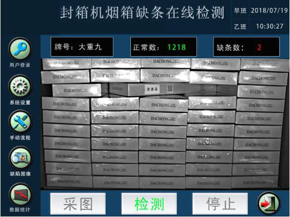 煙(yān)箱缺條在線檢測系統是(shì)基于機(jī÷)器(qì)視(shì)覺技(jì)術(shù)監視(shì)封箱機(jī)裝箱過程,能(néng)夠有(yǒu)效穩定的(de)檢測各種形式缺條及多(duō)層現(xià"n)象,集檢測、報(bào)警、剔除于一(yī)體(tǐ)的(de)檢測裝置。